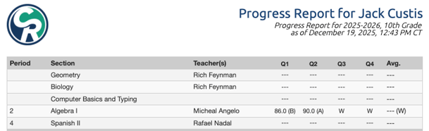 Progress Report - Now shows Dropped Sections - If a student is dropped from a section it will be reflected on the Progress Report with a "W" for withdrawal. This allows schools to more accurately reflect a student's courses for a given year, especially when transferring to another school. Grading Units in the withdrawn section will show a grade if appropriate or a "W" for no grades in that Grading Unit and the Avg. grade will be a "W." If the student never received any grades in the class and you don't want that section to show on the Progress Report, using "Delete" instead of "Dropped" may be a better option.