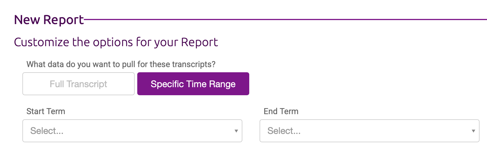 Both reports have the option to select only a "Specific Time Range" to give admins an isolated view of one or more academic terms and the GPA for only that "Specific Time Range."