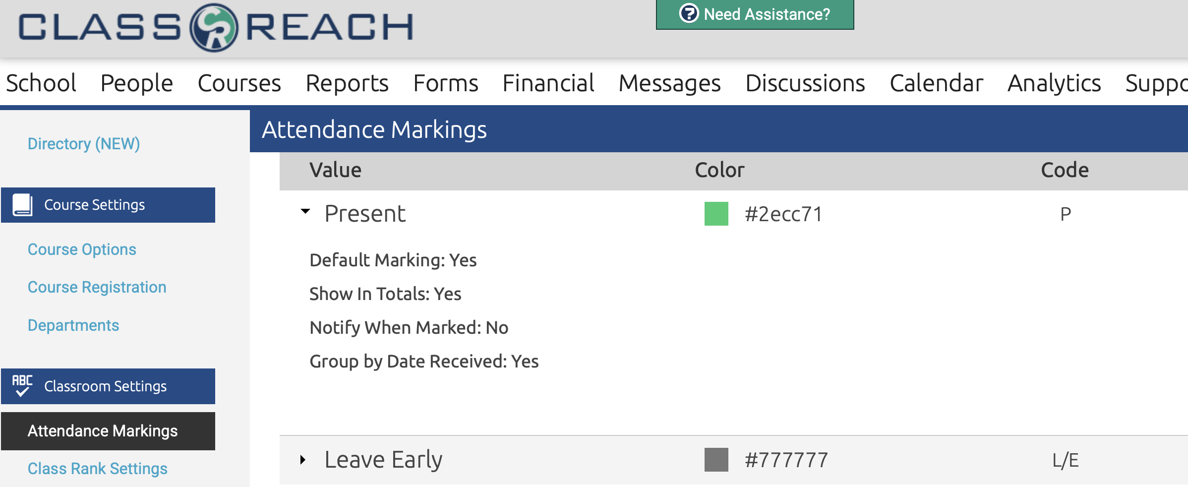 Each one of the attendance markings and values are explained below. Note the difference between Present, Absent and Tardy, Leave Early. Present, Absent are grouped by day received. Attendance Markings are set up in Settings > Attendance