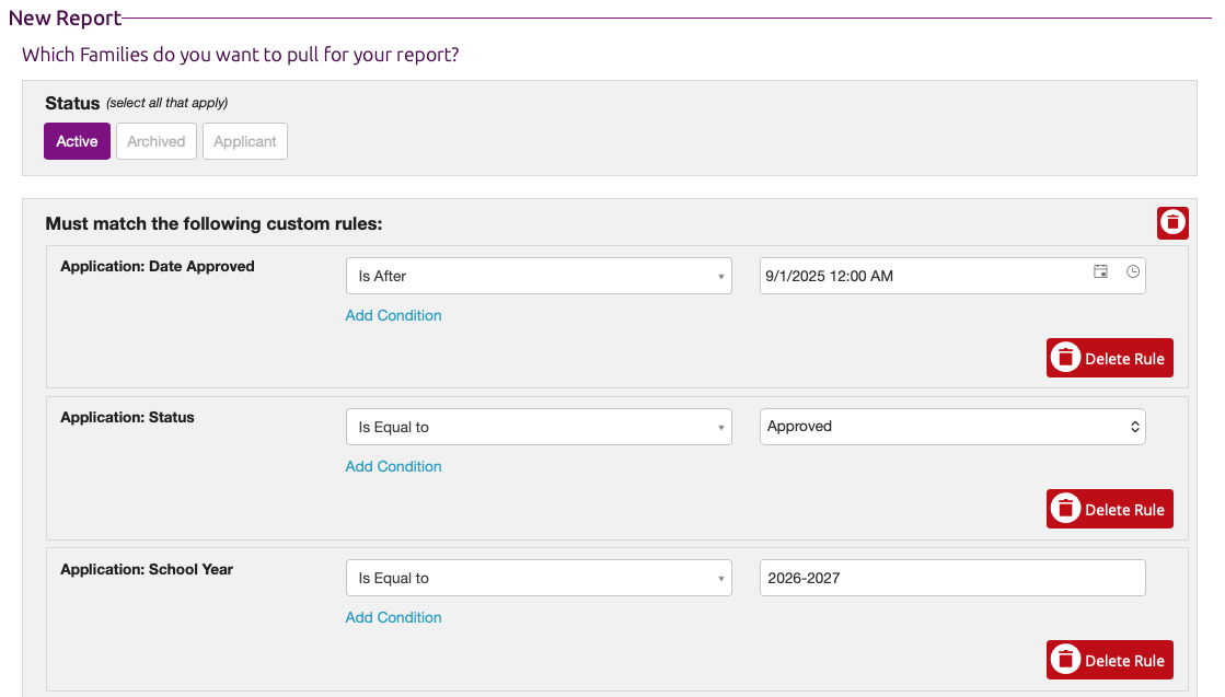 Select Families, then Active Status before you create your Advanced Filters. The Application: Date Approved can be used to limit the date range of your applications, but the main filters to use are the Application: Status is Equal to "Approved" and the Application: School Year is Equal to "2026-2027".