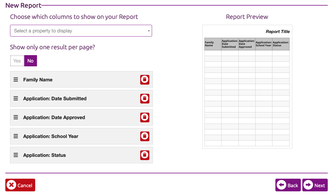 The output of the report is up to you, but this is an example of what you could use. In this report, the Application: Date Approved column and other Application columns will return data from the Family Application.